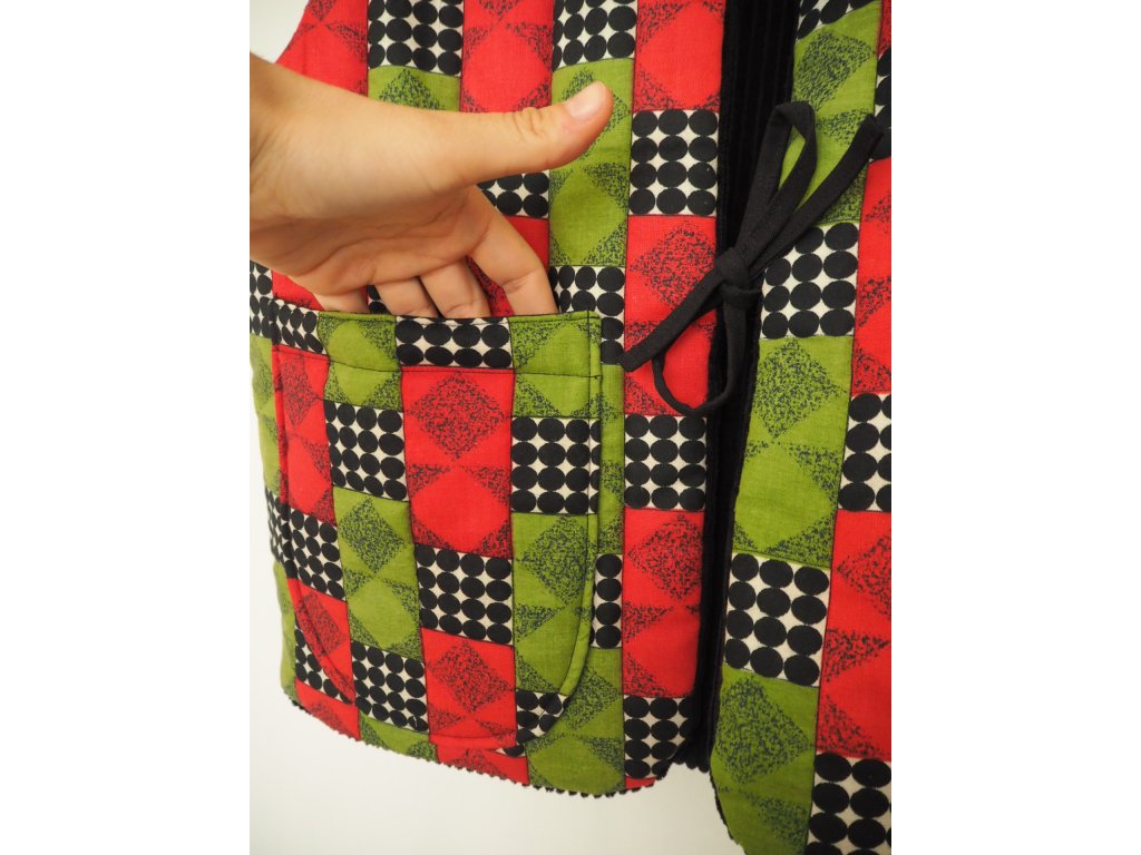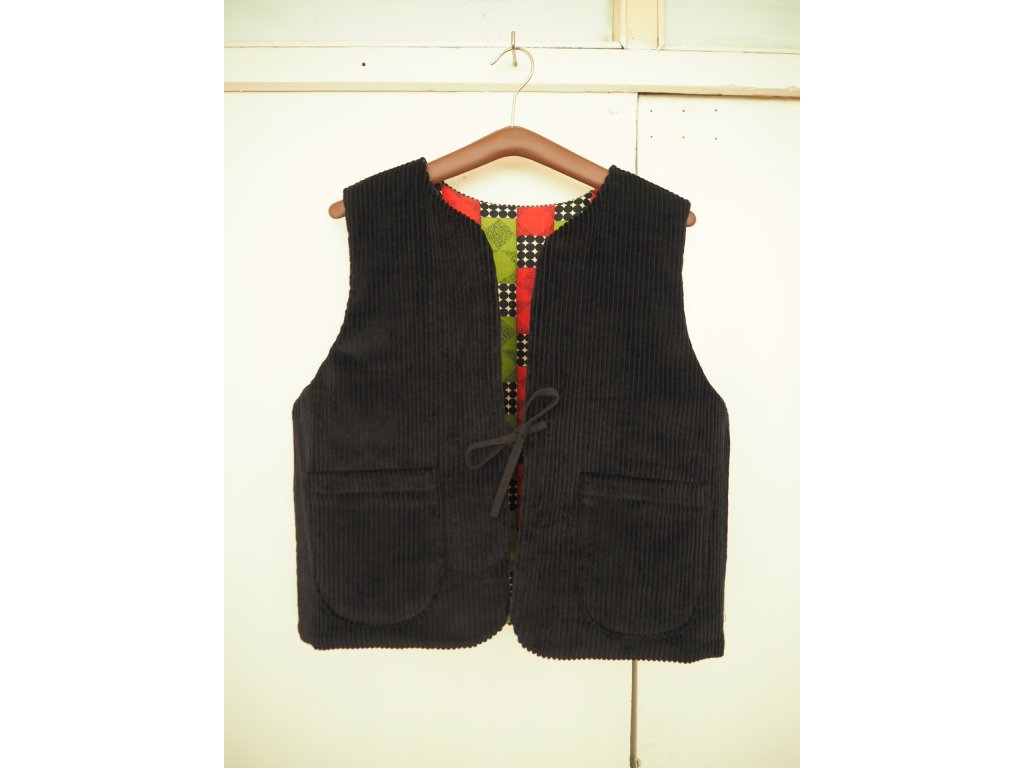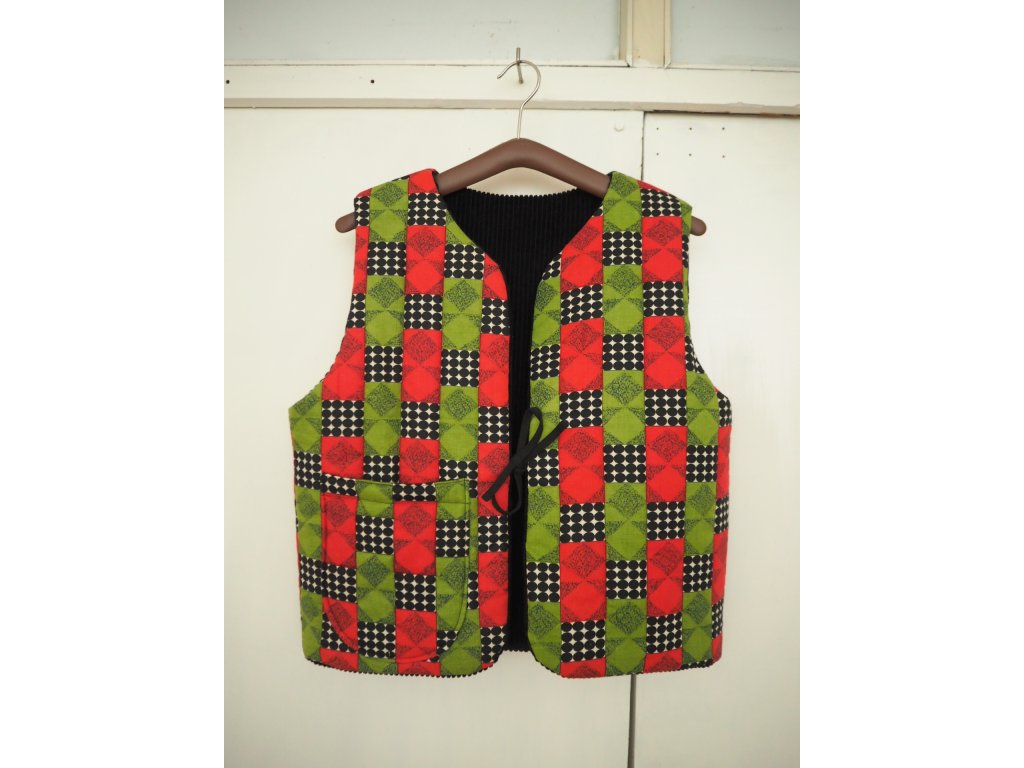Oboustranná vesta ze second hand látek. Z jedné strany retro prošívaná bavlna, z druhé hebký bavlněný manšestr, uprostřed teplý termolín.