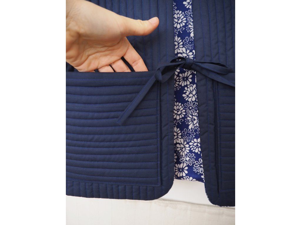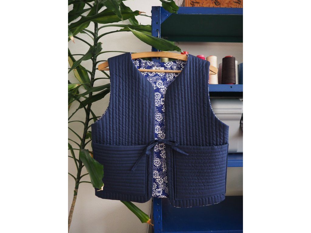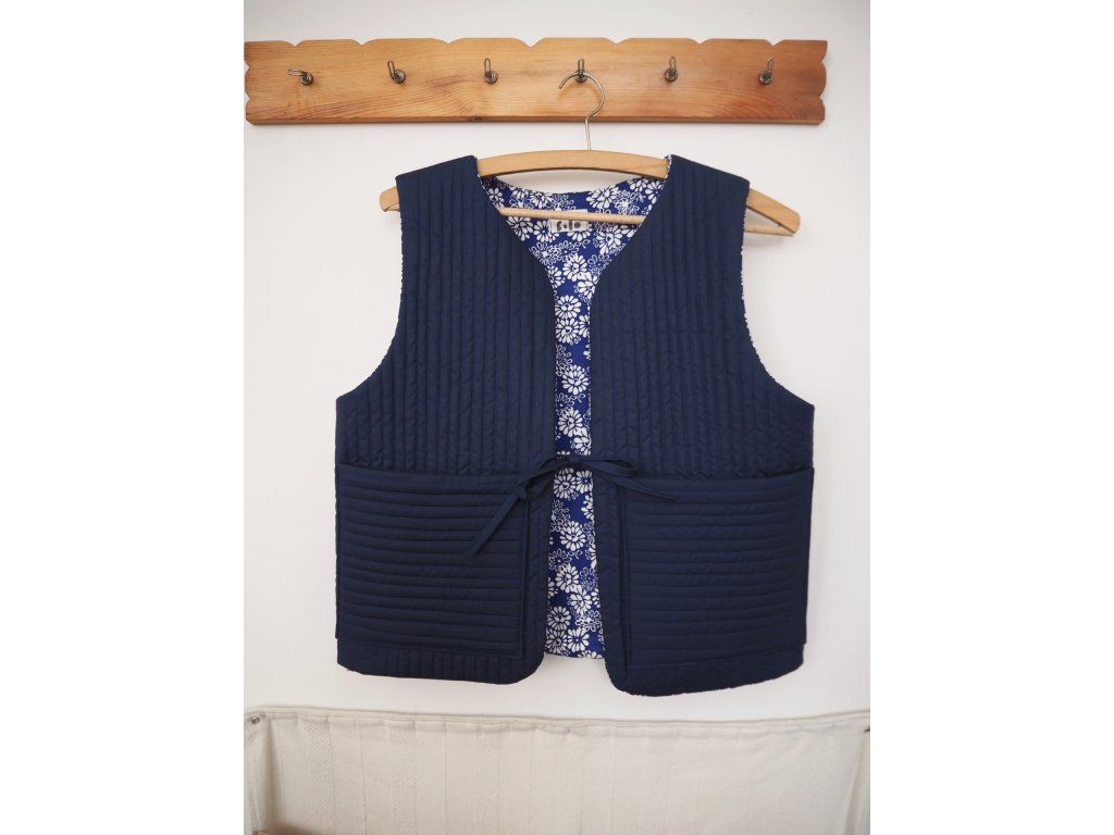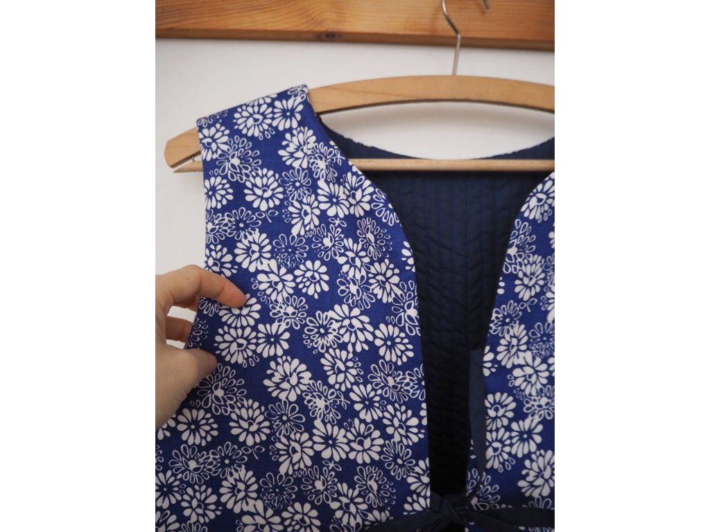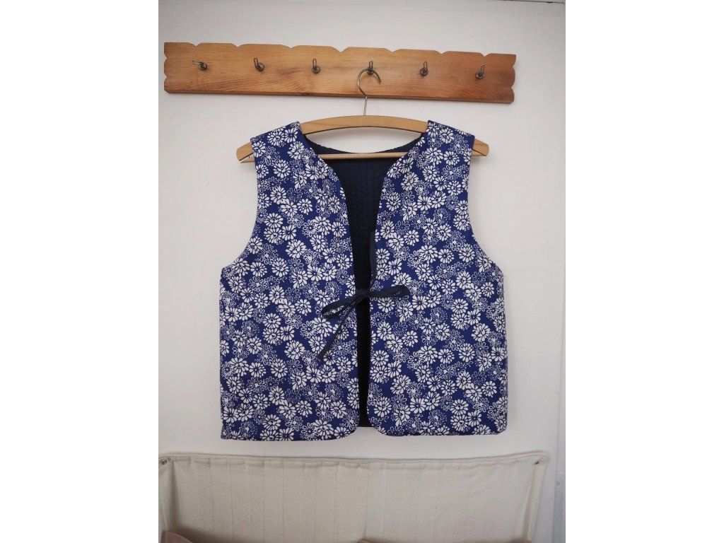 Ušitá z upcyklovaných kvalitních látek, ať už darovaných, sekáčových nebo po babičkách, z útrob skříní. Jedná se o opravdu udržitelný a originální kousek, který vám bude dělat radost dlouhá léta. Tato vesta je ručně prošívaná na vrstvě 180g termolínu. Z jedné strany tmavě modrá lehce lesklá bavlna z druhé modrotiskové plátno s květy. Zavazování na šňůrku a 2 prostorné kapsy.