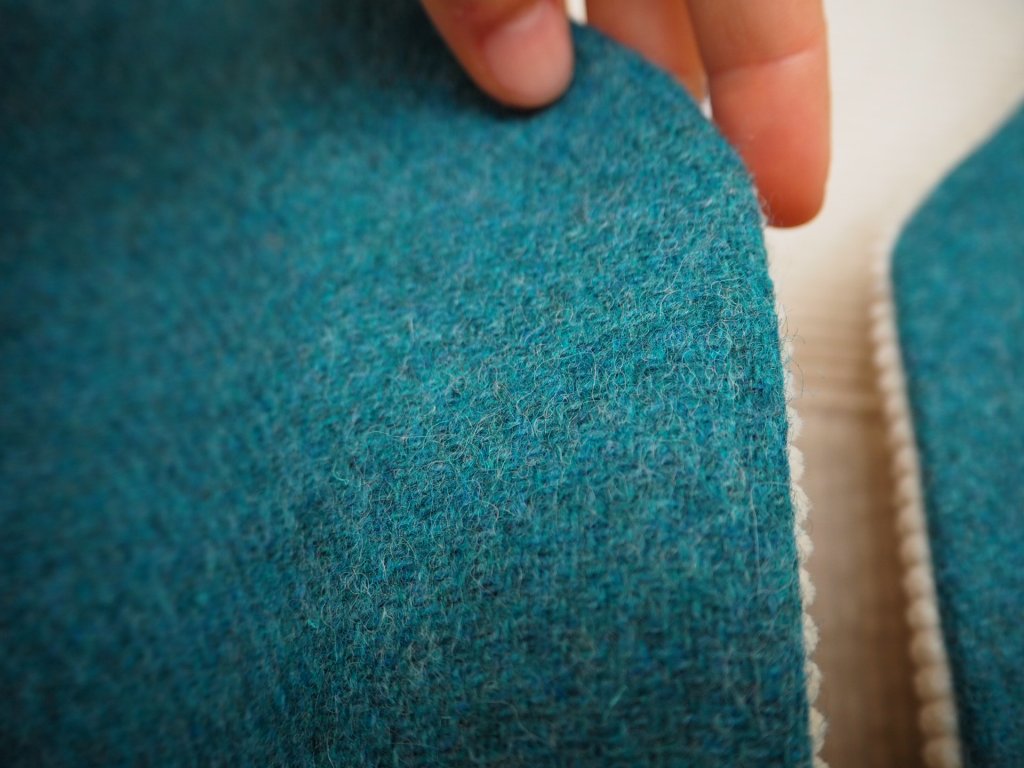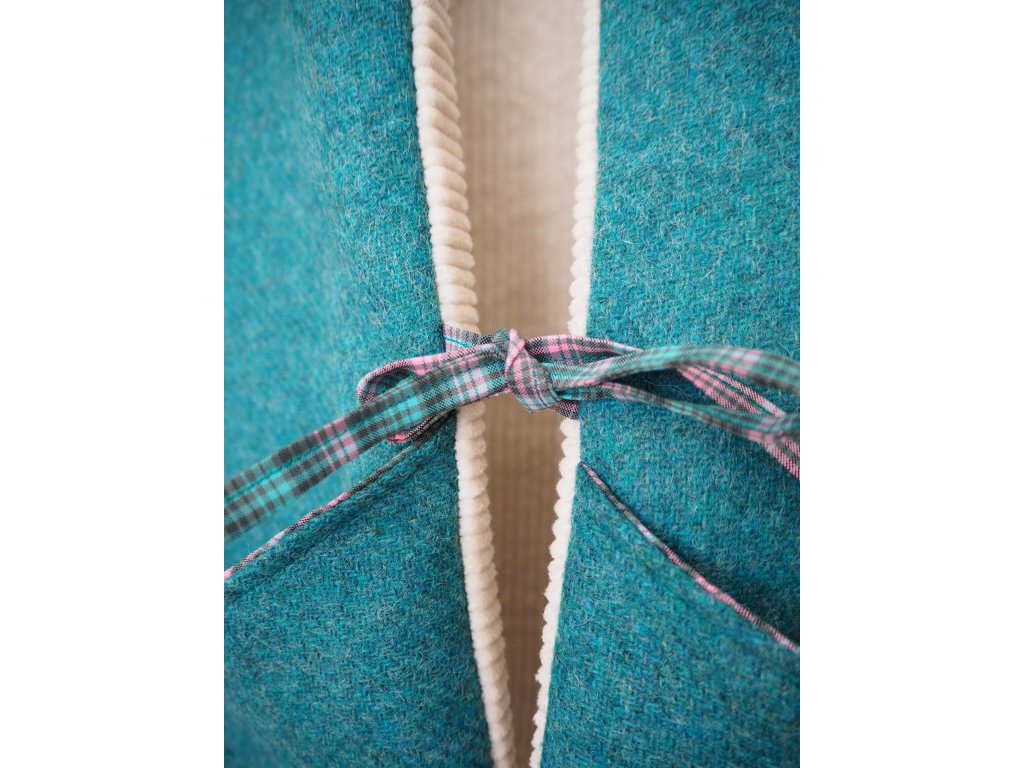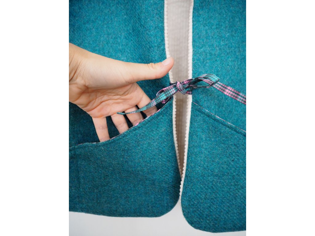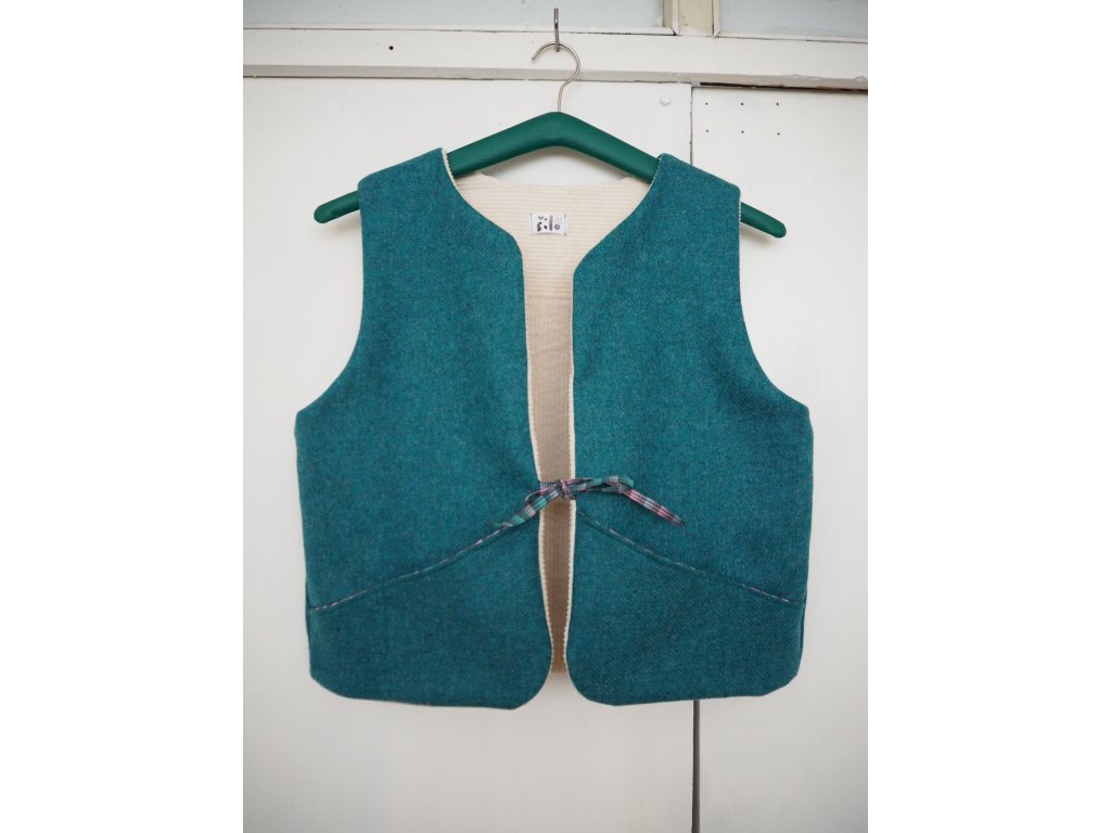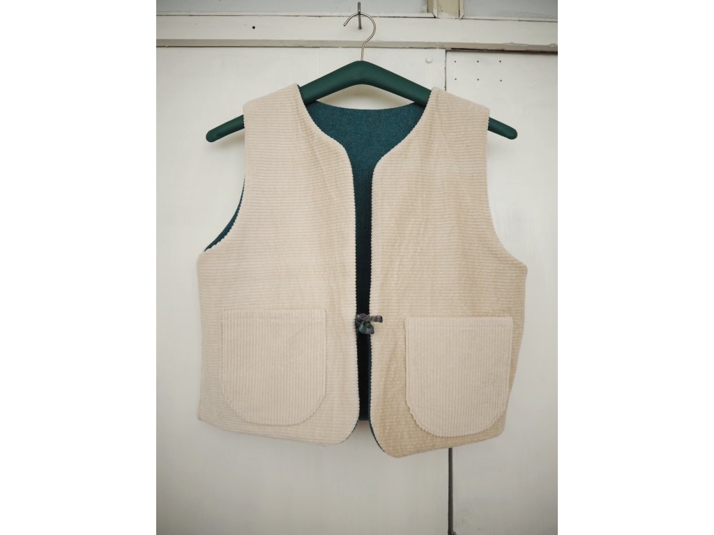 Oboustranná upcyklovaná vesta vlna modro zelená a krémový manšestr
