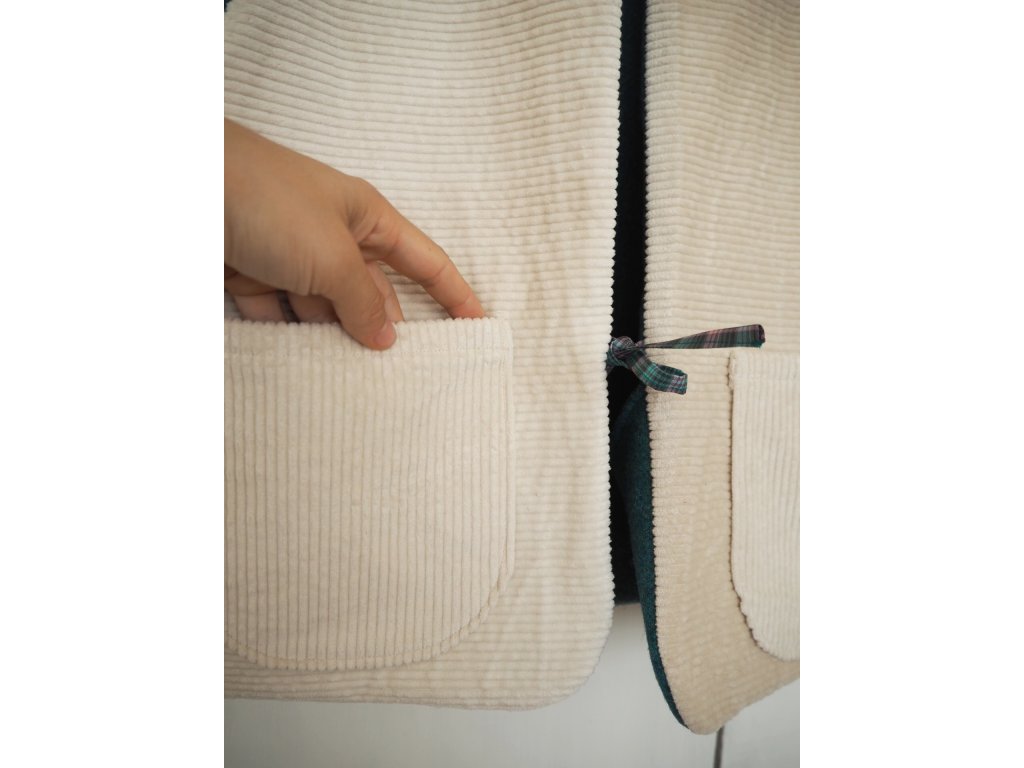 Designová vesta do sychravých dní. Dá se obracet podle nálady nebo tak, aby se hodila k vašemu outfitu. Jedna vrstva je modro zelená stoprocentní vlna a druhá krémový bavlněný manšestr, obojí z druhé ruky. Kapsy na drobnosti nebo zmrzlé ruce jsou samozřejmostí. Zavazování na mašličku.