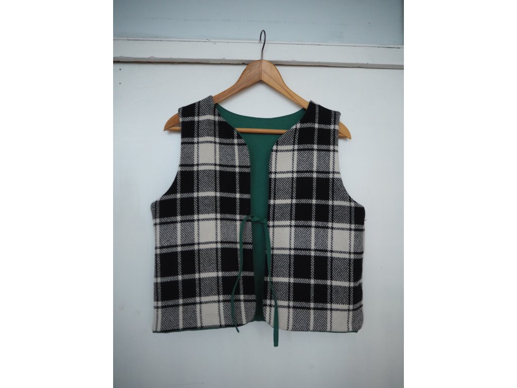 Oboustranná vesta z upcyklovaných materiálů. Zelený bavlněný kepr + 100% černobílé vlněné káro . Velikost S-M