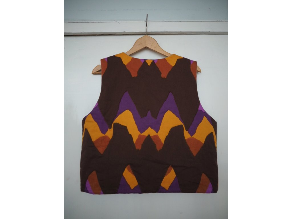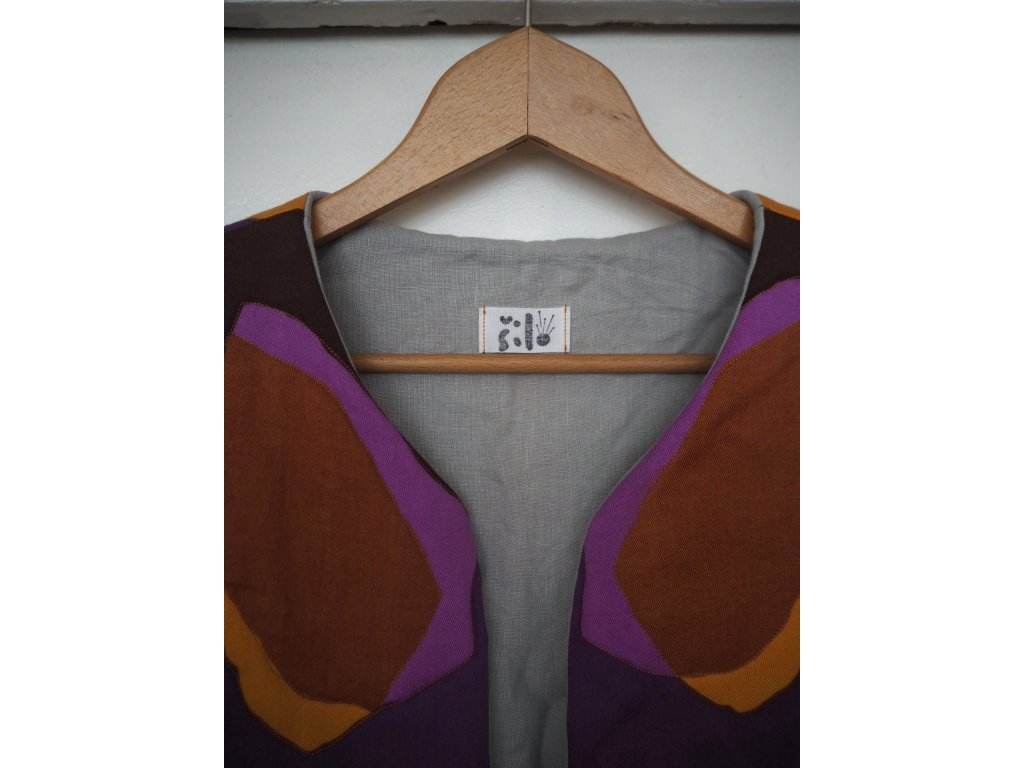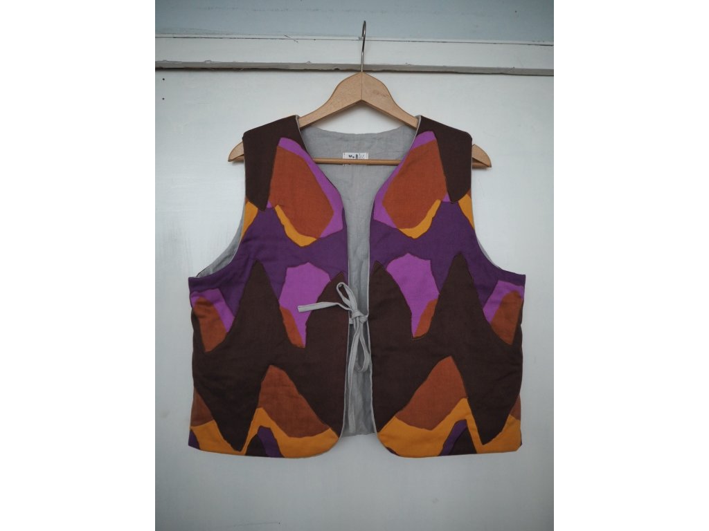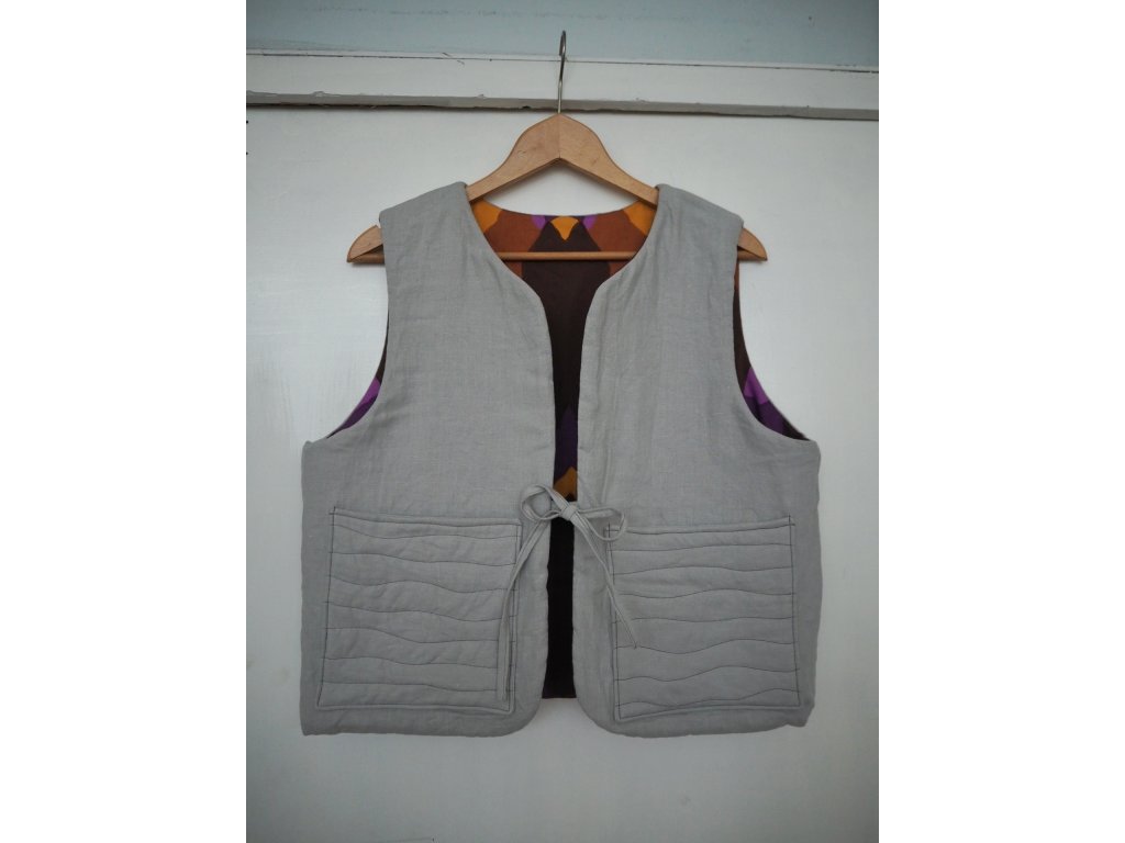 Ušitá ze upcyklovaných kvalitních látek ať už darovaných, sekáčových nebo po babičkách z útrob skříní. Jedná se o opravdu udržitelný kousek, ze kterého nebudete mít výčitky a bude vám dělat radost dlouhá léta. Tato vesta je ručně prošívaná na 180g termolínu. Z jedné strany světlě šedý len a z druhé barevný bavlněný kepr. Zavazování na šňůrku a dvě prostorné kapsy.